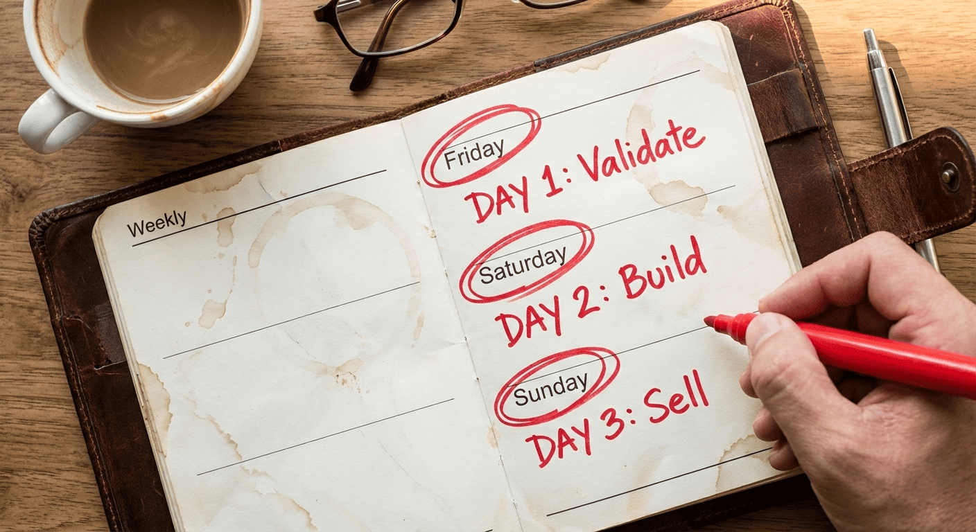 This isn't a motivational speech. This is a tactical blueprint. I’m going to show you exactly how to go from "I have an idea" on Friday evening to "I just made my first sale" by Sunday night.